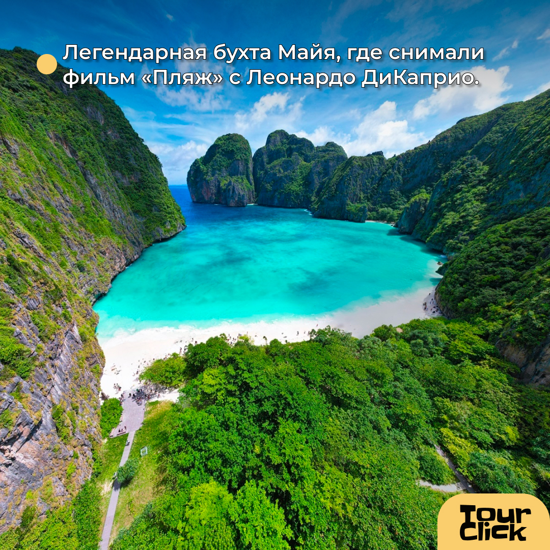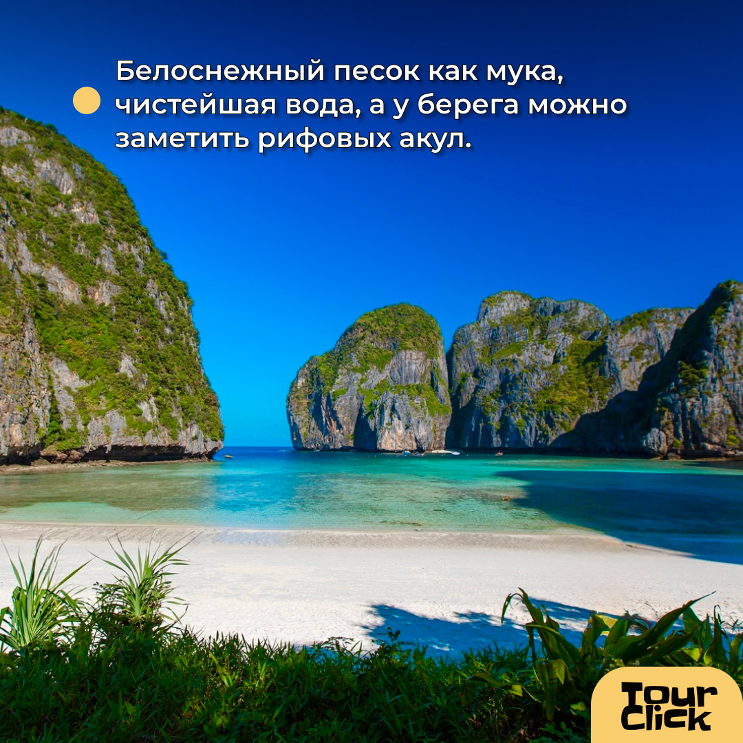 🔹 Следом — легендарная бухта Майя, где снимали фильм «Пляж» с Леонардо ДиКаприо. Белоснежный песок как мука, чистейшая вода, а у берега часто можно заметить рифовых акул — абсолютно безопасных и очень грациозных.